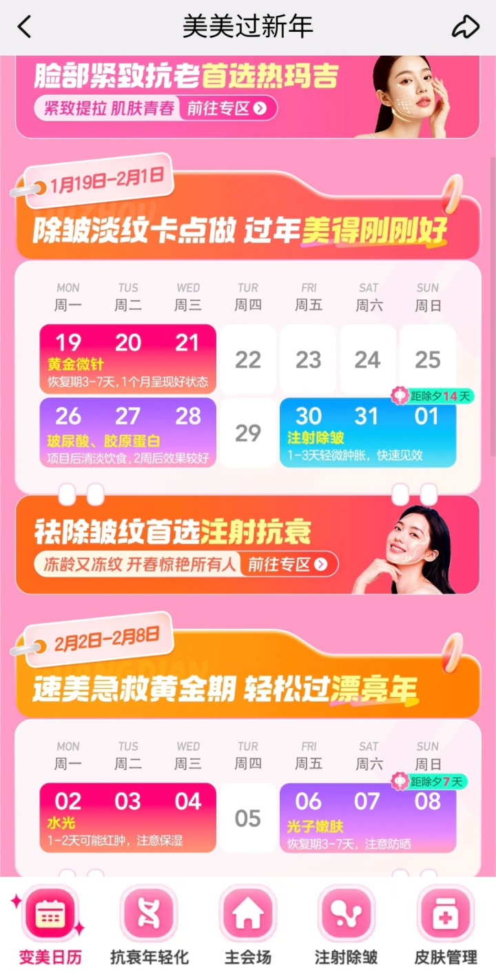 为满足用户节前变美的需求,美团医美近期上线了“美美过新年”活动,并提供3000元医美券包和变美日历,用户可参考日历节点,在合适的时间点选择适合自己的项目。